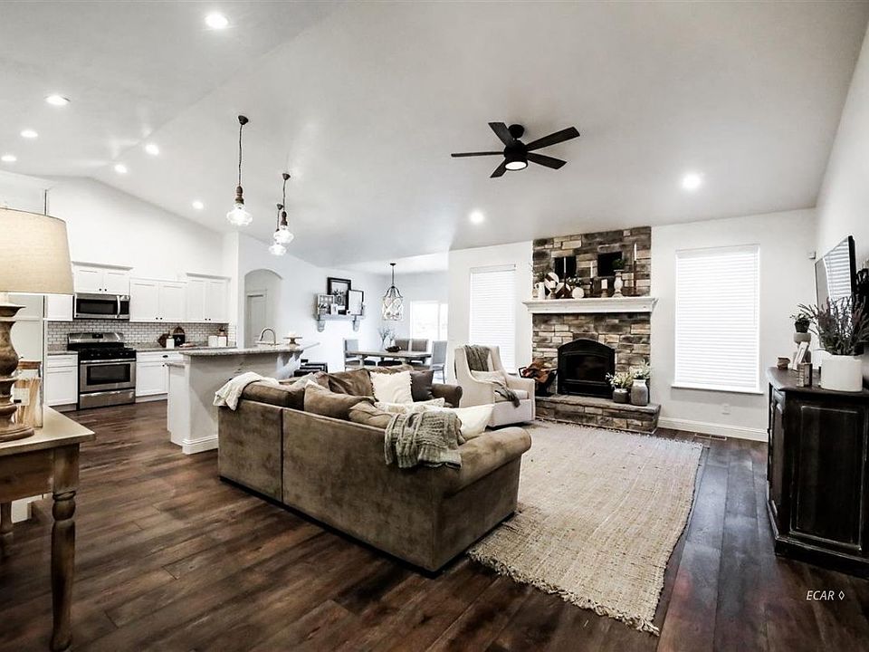 - Flooring- Carpet, Flooring- Tile, Vaulted Ceilings, Flooring- Hardwood, Ceiling Fan(s), Smoke Detectors, Chandelier(s), Insulated Garage