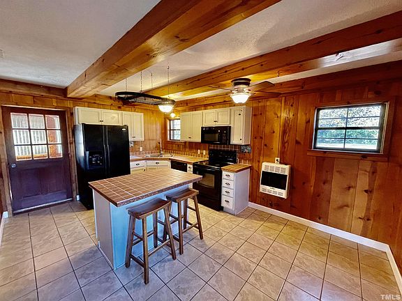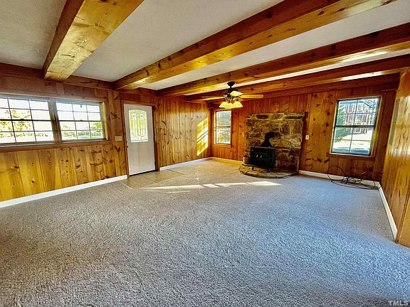 Beautiful, well-maintained farm house on 1.87 acres, complete with a gorgeous stone chimney with wood stove, knotted pine paneling, and exposed beams! Perfect for a mini farm! Live the country life with the convenience of being within an hour of Durham, Chapel Hill, and Raleigh! 2 bedroom, 2 bath, office space, mud room, bonus area upstairs, new carpet, huge yard, all appliances convey (except deep freezer), detached carport and enclosed garage/storage building! Lots of potential for this property!