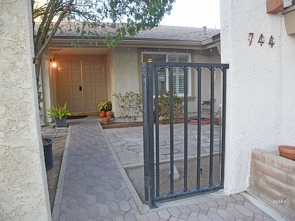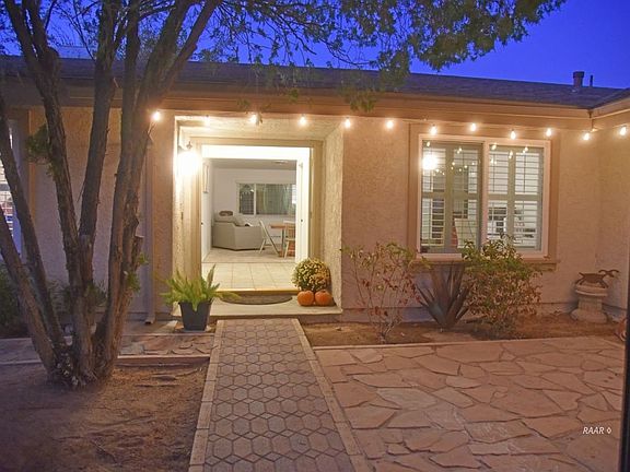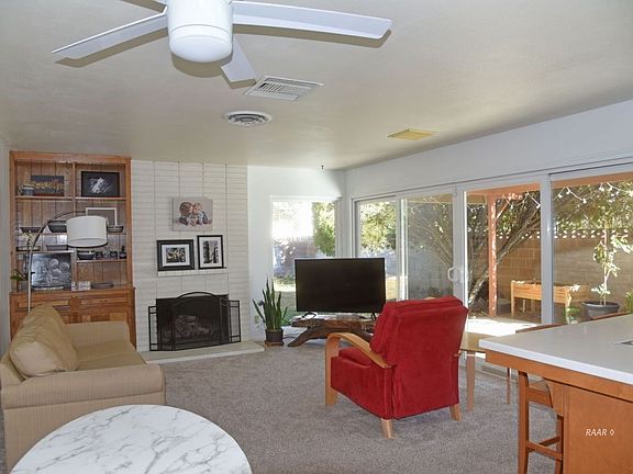 Light & bright 3 bdrm/1 ¾ bath, 1791 sq ft w/many upgrades. Front yard is professionally xeriscaped w/a front courtyard. Double doors enter into a tiled entry w/dining room & large living room. On the east side of the house is a family room w/a gorgeous view to the yard from a wall of sliders & windows, a nook & the kitchen. Updated kitchen w/Corian countertops & a brand new oven on the way. Family room has a fireplace w/gas log. Newer Milgard windows, some w/plantation shutters, & sliding doors, fans & dual cooling add to the livability. Evaporative cooler new in 2015. The master bedroom is a good size w/a master bath that has been renovated w/solid surface counters & custom stain glass windows made by a local artist. The guest bath has a solid surface counter & newer cabinets. The garage is 522 sq ft & has an automatic roll-up door. Backyard is landscaped, on timed sprinklers, enjoy pomegranates straight from your own tree! Large covered patio w/electric & water, perfect for outdoor cooking & relaxing. Sewer line to the street has been replaced! Desirable Deeter built home in an ideal location within walking distance to Las Flores Elementary, Pearson Park, shopping & near base.