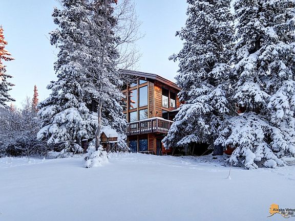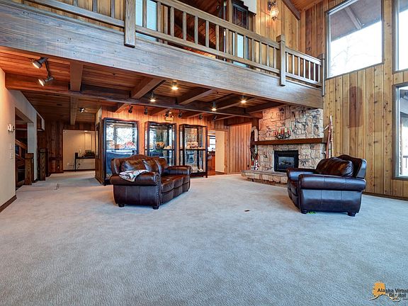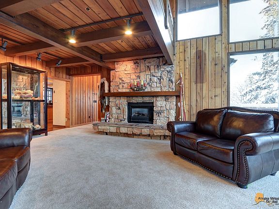 Alaskan Builder's Dream Home, crafted like a luxury lodge! Open beams, vaulted wood ceilings, wood and natural stone floors, wood paneling & built-ins make this spacious home feel cozy and warm. Tall windows & skylights bring all the light in. Expansive decks extend the living space to a hot rock sauna and spill into the nearly 2 acre park-like setting!