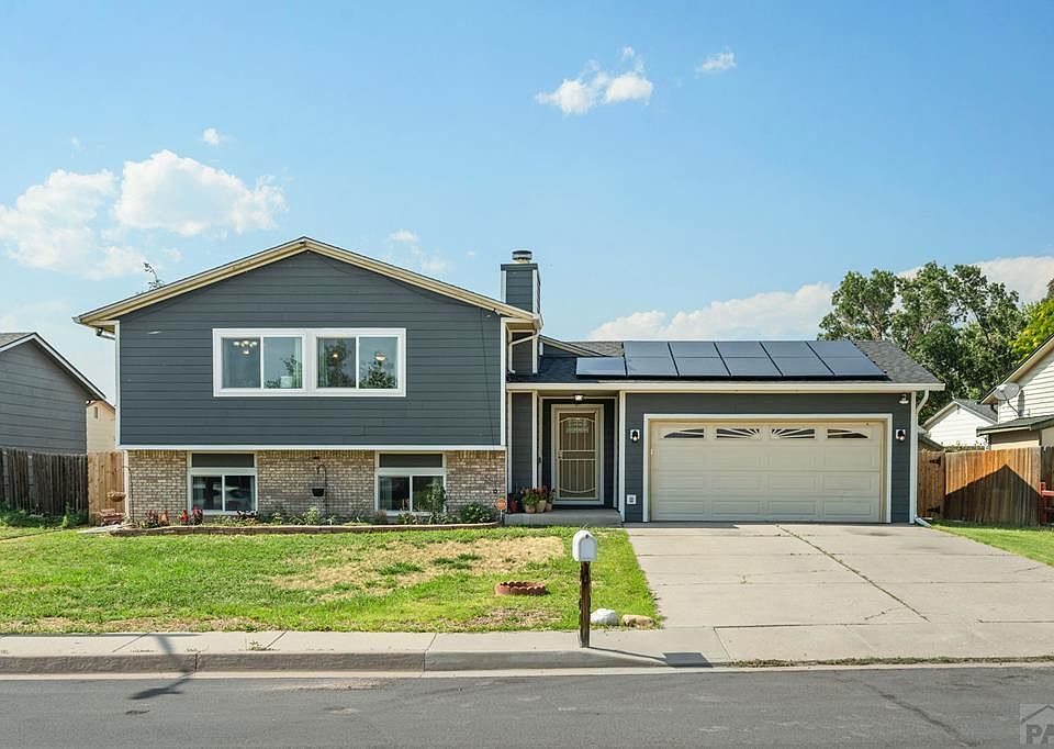 Welcome home to this stunning bi-level in Sunrise Ridge, boasting SIX bedrooms, 3 bathrooms, and a 2-car garage, with a solar system that will be fully paid off at closing! This spacious home offers an ideal layout for modern living, with thoughtful updates throughout. The upper level features a bright, open-concept living space that seamlessly connects the living room, dining area, and a well-equipped kitchen complete with a counter bar, ample cabinet and counter space. Head down the hallway to the generous primary suite that is a true retreat with a skylight, en-suite bathroom, and a walk-in closet. Two additional bedrooms and a full bath complete the upper floor. Downstairs, you'll find a large family room perfect for gatherings or relaxing by the cozy wood-burning fireplace. Three more bedrooms and an additional full bathroom provide flexibility for guests, home offices, or multigenerational living. Enjoy peace of mind with numerous recent upgrades, including all new windows (2025), a new roof (2023), a water filtration system (2023), HVAC system (2020), water heater (2022), solar panels (2021), and newer siding, gutters, fencing, kitchen appliances, fresh paint, and brand-new carpet throughout. Conveniently located near Fort Carson, shopping, restaurants, parks, and more, this home checks all the boxes. Schedule your private showing today—this one won't last long!