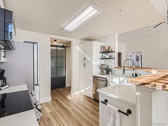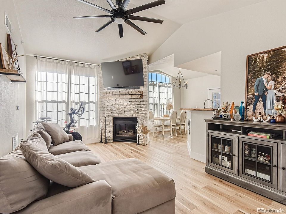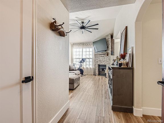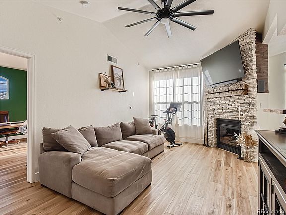 Welcome home to this stunning 2 bedroom 2 bathroom top floor, corner condominium beautifully renovated from top to bottom in 2022. Cozy up in front of the gorgeous, dry stack fireplace with an impressive 150 year-old, white oak, barn beam mantel in the vaulted, open concept great room. New, contemporary light fixtures and new luxury vinyl plank flooring complete the look. The tastefully updated kitchen includes beautiful new cabinetry with iced white quartz countertops, a contemporary faucet, updated hardware and tile backsplash in addition to all new high-end Samsung appliances. The ensuite bathrooms have been updated with new vanities, beautiful countertops, tile flooring, contemporary light fixtures and faucets. Laundry room updates include new tile flooring, high-end Samsung washer and dryer and a stunning, steel and glass panel barn door. Enjoy your morning coffee taking in the views from the covered decks off of each bedroom. Spacious walk-in closets in both bedrooms. Water heater replaced in 2022. No more scraping car windows in the winter with the detached garage. This condominium looks and feels like a new build. Amenities include 5 minutes from Shopping, Playground Area, Business Center, Sand Volleyball Courts, Spa Whirlpool, Billiards Room, Clubhouse and State of the Art Fitness Center. Located in high-demand Windmill Creek and the award winning Cherry Creek School District, this location is ideal being close to Dove Valley, home of the Denver Broncos, and near I-25, the Denver Tech Center and old town Parker.