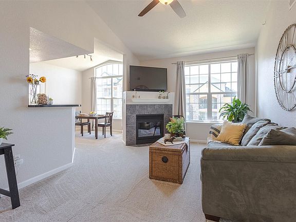 2 bedroom, 2 bath condo feels brand new and is sparkling clean. New paint and carpet throughout. Bright, open floor plan with vaulted ceilings in the family room and master bedroom. Each bedroom is essentially a master suite with private bathroom and balcony. So many great features including gas fireplace, ceiling fans, walk-in closets in both bedrooms, breakfast bar in kitchen plus separate dining area, large storage closet on the balcony off the kitchen, green belt directly behind the building, large laundry room (washer/dryer included), pet-free and super clean. Enjoy the convenience of the large fitness facility in the community clubhouse and the huge pool. Convenient location close to E470, DTC, shopping, and dining. No projects needed here...just move in and enjoy your beautiful home!