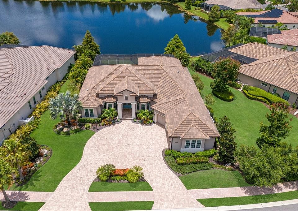 Situated on a picturesque and serene lake setting, this expanded Murano II residence in the gated Lakewood Ranch community of Country Club East showcases generously proportioned indoor-outdoor spaces, volume ceilings, IMPACT WINDOWS and DOORS, and even boasts a GENERATOR. Widened from Lee Wetherington’s original floor plan, this four bedroom residence boasts 3,969 square feet of expansive one-story open living and a breathtaking outdoor living area with abundant open and under cover spaces, pecky cypress ceilings, travertine deck, summer kitchen, heated saltwater pool/spa, and sublime vistas. Seamlessly connecting this resort-styled lanai to the oversized great room and dining areas are disappearing 10’ impact glass doors into 13-foot tray ceilings. Chefs will delight in the beautifully appointed gourmet kitchen with SubZero, Wolf and Bosch appliances, sprawling granite counters, oversized island, wood cabinetry, wine refrigerator, dovetail soft-close drawers, and an oversized walk-in pantry. Behind double French doors off the lanai and pool bath is a voluminous bonus room with built-in desk enhanced with disappearing impact glass sliders that open to reveal the serene outdoors. Additionally the residence offers a study/den off the great room with double French entry doors, bay windows and crown molding. Relax and unwind in the elegant owner’s retreat positioned on its own private wing, offering two oversized walk-in customized closets, direct lanai access, built in feature wall, remote privacy shades, and a luxuriously appointed spa-like bath with separate vanity stations, separate make up vanity, built-in bench that hides the plumbing for a tub, and stand-alone oversized shower. Overnight visitors will be right at home in three additional generously sized guest suites, all with walk-in closets. Other highlights of this 5,509 total square foot residence includes a conveniently located powder room, all solid interior doors, impact windows/doors/sliders, a generator, laundry room with cabinetry, sink, and closet, an air-conditioned Florida “basement”, pavered circular driveway, and an oversized three car garage with epoxy flooring and an air-conditioning wall unit. Country Club East provides its residents with the privacy of gated-community living, three community pools, and fitness center, all within a renowned community infamous for its vibrant Lakewood Ranch lifestyle near dining, shopping, polo, golf, tennis, community events and still close to the UTC area, the beaches of Sarasota, and, of course, in an A-rated school district near Out-of-Door Academy and just a few miles from IMG. Residents also have the non-mandatory option to become members of the Lakewood Ranch Golf and Country Club, which offers four championship golf courses, two clubhouses, tennis, pickelball, fitness center, heated pools, full social calendar and so much more.