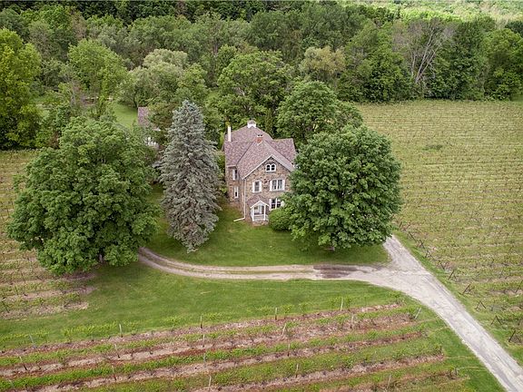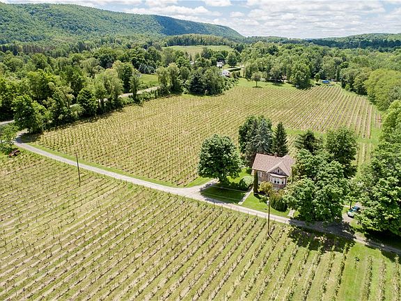 Wine Country Elegance - One of the most picturesque settings in the Finger Lakes area of upstate New York. 1882 Stone Home on 46+ acres with approx. 15 acres of manicured grapes. Home consist of 3,200 square feet with 4 bedrooms and 2 full baths. Living room w/gas fireplace, spacious formal dining room w/wood burning stove. Natural woodwork and pocket doors. Relax and enjoy the private surroundings from an enclosed (sunroom) porch. Full walk-out basement with its own wood burning fireplace and bar area. Large storage/equipment barn, storage shed and 2 car detached garage. Pond, Cold Brook Trout Stream runs through the property. Property has lots of options to creative buyer.