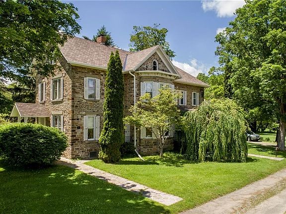 Wine Country Elegance - One of the most picturesque settings in the Finger Lakes area of upstate New York. 1882 Stone Home on 46+ acres with approx. 15 acres of manicured grapes. Home consist of 3,200 square feet with 4 bedrooms and 2 full baths. Living room w/gas fireplace, spacious formal dining room w/wood burning stove. Natural woodwork and pocket doors. Relax and enjoy the private surroundings from an enclosed (sunroom) porch. Full walk-out basement with its own wood burning fireplace and bar area. Large storage/equipment barn, storage shed and 2 car detached garage. Pond, Cold Brook Trout Stream runs through the property. Property has lots of options to creative buyer.