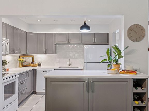 kitchen, fully renovated in 2019, features sleek gray cabinetry, subway tile backsplash, a large single