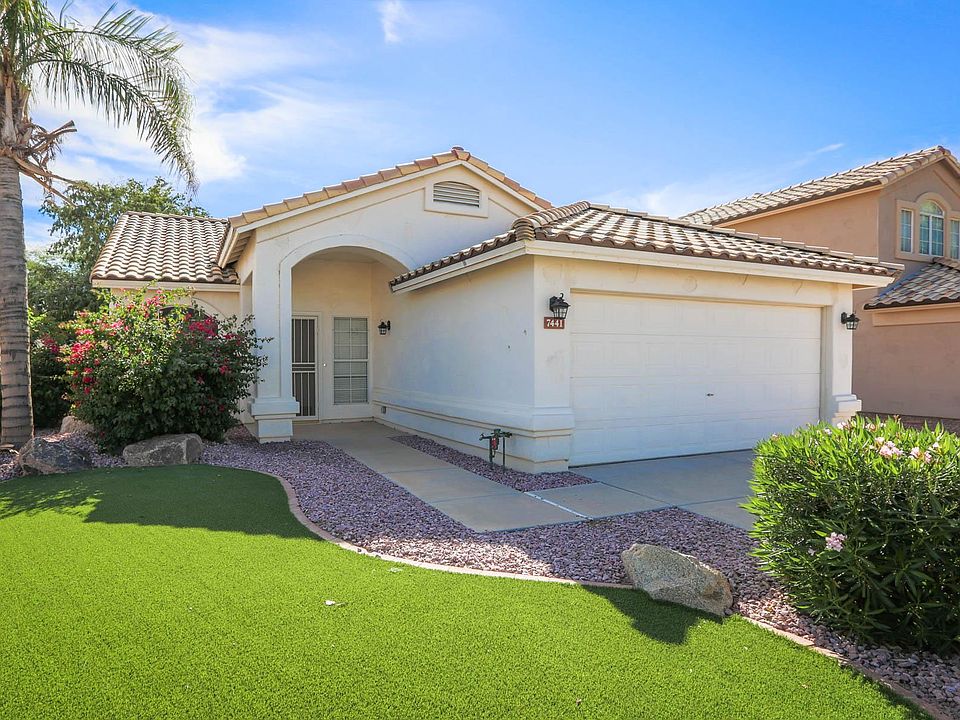 Don't miss your chance to live in this amazing 3 bedroom /2 bathroom home with a two car garage! Enter the living room and notice the beautiful look and feel of the interior which features tile and laminate hardwood flooring, a neutral color palette, and ceiling fans. The updated kitchen comes complete with a breakfast bar, pantry, granite counters, and all the stainless steel appliances you will need including a refrigerator, dishwasher, and a microwave! Enjoy an additional living space that open right off the kitchen. Inside laundry room with full/washer/dryer included. The master bedroom includes a walk-in closet plus a private bathroom. Enjoy sunny Arizona in your fenced in private backyard with a covered patio and perfect mix of desert and grass landscaping! This home is conveniently located near shopping outlets, country clubs, restaurants, and the loop 101, loop 303, and the State Route 60 freeways. Contact us to see this home today! No pets please.