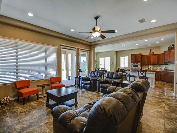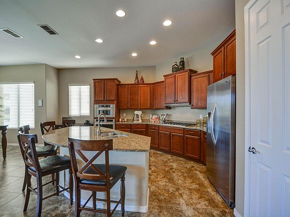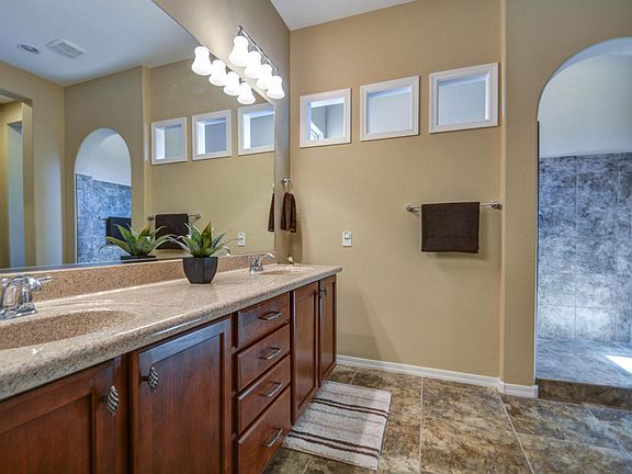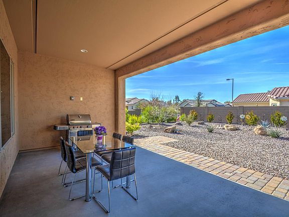 PRICE REDUCED-CHEAPER THAN NEW! WOW! MOVE-IN READY SPARKLING CLEAN. One year home WARRANTY included! Beautiful Tuscan exterior on premier corner lot w/private south backyard in cul-de-sac. Features great room w/coffered ceiling, 2 MASTER SUITES & EXTENDED garage for a golf cart/projects. Kitchen boasts upgraded granite counters, expansive island, Kitchenaide SS appliances, upgraded cabinets w/hardware & roll-out trays. Large dining area. Flexible spaces for crafts/hobbies. Other upgrades include CUSTOM tiled walk-in shower, GRANITEX double sinks in master bath, large guest suite w/full bathroom & walk-in closet, & HALF BATH. Tankless water heater, water softener, R/O, ceiling fans, neutral paint, built-in GARAGE CABINETS, paver walkway, stucco garbage can enclosure, BBQ gas stub, etc.