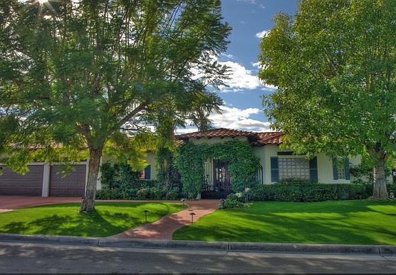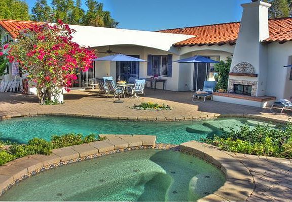 Covered Wagon Trail is a quiet street,close to El Paseo and backs to exclusive Vintage CC. Charming Mini Hacienda has great natural light, 3108 sf, 10 foot ceilings, 4B/4B, multiple private patios, plus a gym/media room. Updated kitchen: stainless & granite, island, desk and large pantry opens to casual dining area and Family Room with stone fireplace. Separate Living Room, Dining area and large laundry room. Plantation shutters, walk in closets, plentiful storage in home and in 3 car garage. Private and sunny South facing yard is an entertainer's delight: tumbled pavers, pebbletec saline pool/spa with slide, custom outdoor fireplace, BBQ island, outdoor shower. Beautifully landscaped, rose garden, fruit trees AND a separate dog run! Master Suite is separate from others and opens to patio with dual walk in closets. Desirable PD Charter schools. Location, private, peaceful, room to roam and NO HOA's!