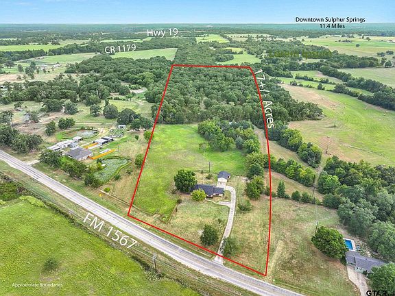 **** IMPROVED PRICE ****Welcome to 7442 FM 1567 W, Sulphur Springs—a beautifully updated home situated on a spacious, mature landscaped lot. This property offers a rare opportunity with 17 acres, fully fenced and cross-fenced, making it horse friendly and perfect for equestrian enthusiasts or anyone seeking plenty of room to roam. The 1,928 sf residence offers 3 bedrooms and 2 full baths in a thoughtfully designed layout, including a welcoming foyer, living room with a cozy wood burning stove that adds warmth and charm, crown molding, and bay windows. The kitchen shines with granite countertops, a breakfast bar, double sinks, pantry, and abundant cabinet space. Enjoy both a breakfast nook and a dining area, ideal for everyday meals or entertaining guests. The master suite features a walk-in closet and a double vanity. Enjoy the comfort of central air and heat throughout the home. Other highlights include tile and laminate flooring, new roof, water heater just 3 years young, French doors, ceiling fans throughout, fresh paint, laundry room with storage, 2-car attached garage, and a detached garage/workshop, garden shed, wainscoting, front porch, and back patio. This unique property is only minutes from Lake Fork and Sulphur Springs. Schedule your tour today!