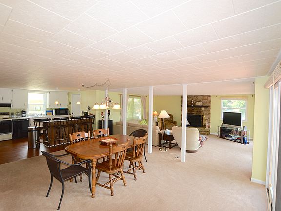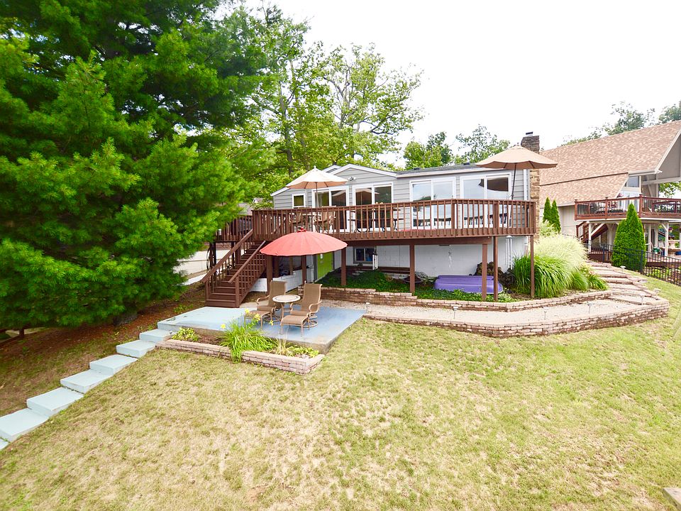 Great lake point lot w/100' lake frontage with beautiful views from all windows down entire lake. Great open floor plan. Plenty of outdoor living to enjoy magnificent views. Kitchen with large breakfast bar. Dining Room with slider out to over sized upper Deck with fantastic views of the lake, great for entertaining guests. Great Room with floor to ceiling Brown County stone wood burning fireplace. Two Bedrooms, one full Bath. Large storage area under home great for lake toys and Patio furniture. Concrete Patio overlooks the lake. Party Deck in quiet wide cove great for swimming in no wake zone in deep water off Dock w/steps down to own beach with pea gravel. Pontoon boat lift. Easy walk to waters edge. New roof, new plumbing.