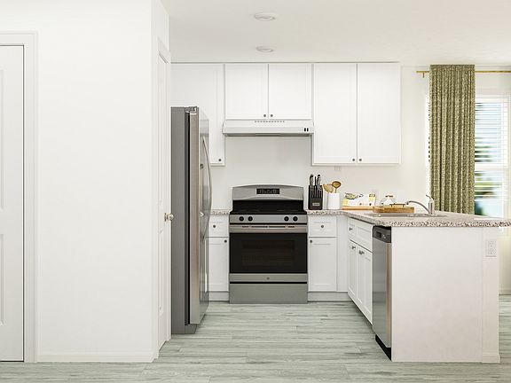 A single-story home that features an open living area with a kitchenette and a full bathroom in the back of the home. Beside it is the bedroom with ample space to relax, complete with a full-sized closet. Prices, dimensions and features may vary and are subject to change. Photos are for illustrative purposes only. Estimated COE April 2023.