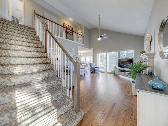 You won't want to miss this well maintained half duplex and maintenance provided 2 Story home! Prime cul de sac location close to highways, amenities & De Soto Schools! Low monthly HOA fees. Original owners. Upgrades galore with a large and private treed backyard. Kitchen & Dining Rm remodel '20. Beautiful quartz countertop, new backsplash, fresh white cabinets & farmhouse sink. Hardwoods added to entire main floor '22, new paint int & ext, new light fixtures, dishwasher, garbage disposal & new garage door opener/keypad. Exercise enthusiast? Check out the exercise rm w/ equipment that is staying, yoga wall, mirrored wall & swiss tracks floor! The floor is so tough that you can drop a weight & it won't crack - Nascar uses this floor!! Totally private backyard with loads of wildlife and an open vaulted Great Rm with fireplace & lots of natural light. Great neighborhood, friendly neighbors, community parks and trails with easy access for kids to walk/commute to schools. Great for all ages. Pet friendly community with dog waste stations & trails. The large unfinished basement provides an abundance of storage or it can easily be finished to create more space. You will love this home and everything that it has to offer! All that you have to do is MOVE RIGHT IN! It is extremely charming! This is your lucky day - not only did the Chiefs WIN, but this home is back on the market, at no fault to the Sellers!