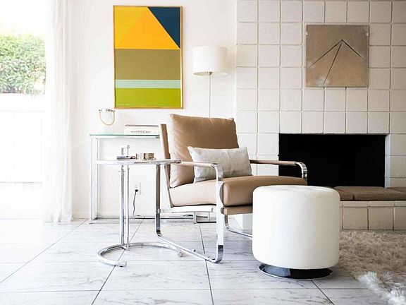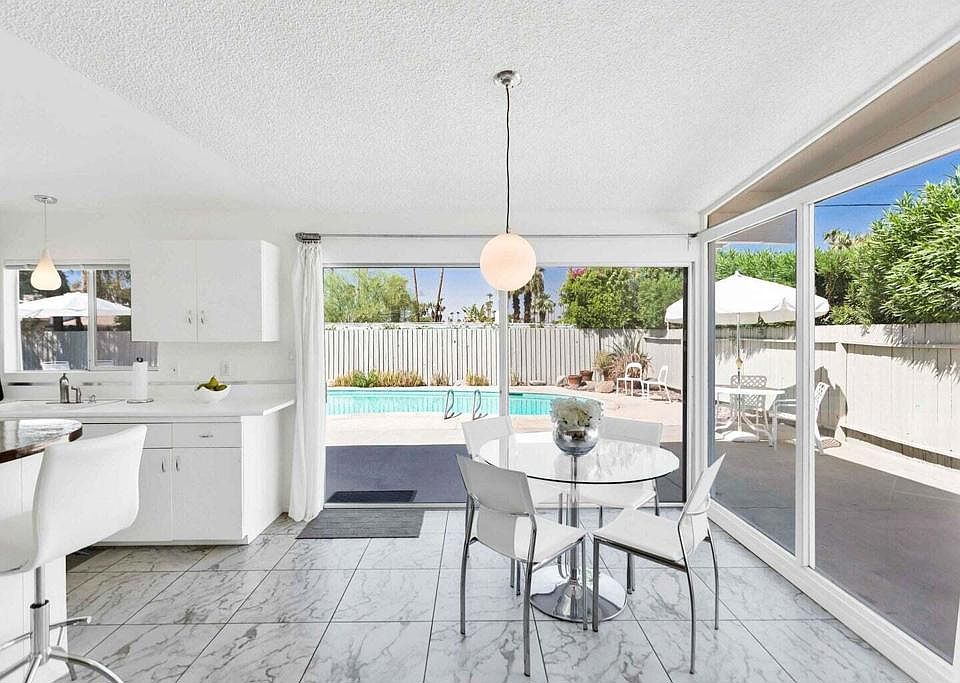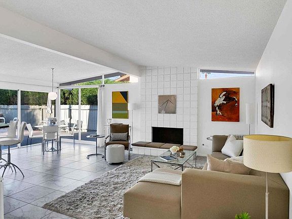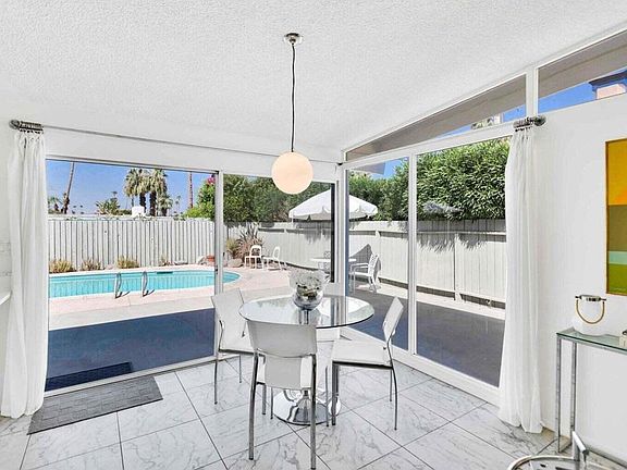 Fabulous 1960 mid-century modern pool home located in So Palm Desert on a quiet cul-de-sac and just minutes from World Class dining and shopping on El Paseo. This home is all original and has been lovingly cared for and restored by Designer John Anthony Turturro. Peaceful and quiet, you will enjoy this bright and airy open floor plan that is filled with glass and light, with gorgeous mountain views from every room and a gaslit fireplace in the living room for cooler evenings. This home features a large living room, open to the dining room and galley-style kitchen with high beamed ceilings and a cool kidney shaped breakfast bar, with great views out to the backyard and pool. The private primary bedroom includes an ensuite, and large walk-in closet. The 2nd bedroom, and bath are located off the main hallway with a large linen closet, and the bonus room is perfect for a den, office, or work-out studio, with pool views that round out the flow of this contemporary open plan. The 2 car-carport with large storage room, and the mid-century block wall, add to the home's original charm. This property comes beautifully furnished in a neutral, luxurious color palette, with original artwork, rugs, and accessories. All appliances are included. New HVAC, pool pump, newer energy efficient roof, and PEX plumbing, make this a wonderful home. Take advantage of this truly turn-key opportunity and enjoy a piece of Palm Desert history.