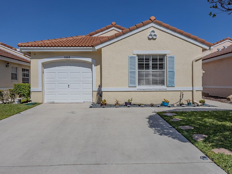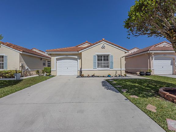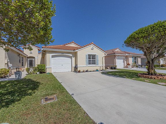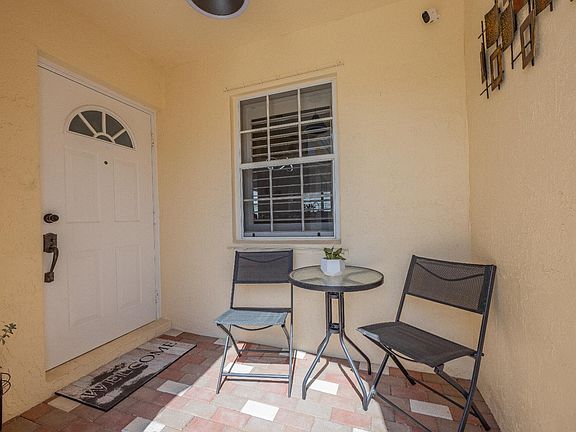This well maintained 2/2 with a den. Beautiful travertine floors throughout and plantation shutters give this home that unmistakable sunshine state laid back kind of vibe. Open concept, split bedroom floor plan with the ability to convert the den to a 3rd bedroom. The kitchen offers an eat in area with granite countertops and is open to the dining area making entertaining a breeze. Finally, relax and enjoy those beautiful warm Florida nights right on your own covered patio.Pull down attic storage and hurricane panels. Community pool and close to shopping and great schools. The roof is 2015, AC is newer and repeatedly serviced. The HOA covers cable and also trims the front yard and trees as well as common areas. Rear yard for the pets as well.