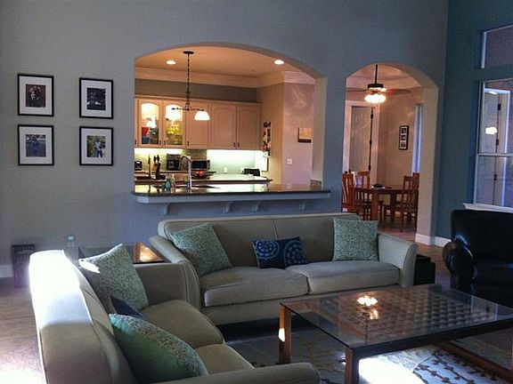 Fresh, clean, detailed 1 story custom home is move-in ready! The entry leads to a living room with 16 foot ceilings, 2 ceiling fans and a fireplace with stone tile and quality ceramic tile hearth. The kitchen has two sinks, double ovens, granite counters, glass tile, lighted cabinets, lots of space for cooking and entertaining. The storage space is incredible, 2 large pantries, 1 has space large enough for a second refrigerator. There is an isolated bed and bath next to the kitchen and dining area. The 4 car garage is extra deep, one space is tandem. The largest bedroom with bath has a huge walk-in closet with doors on either side of the shower. A tall built in chest has many drawers on both sides. You must see it for yourself! All doors are 8 feet tall and there are 2 AC/heating units. The serene back yard faces east, perfect for an early morning coffee on the patio and it's cooler for hot summer evenings. In last 3 years all fans and lights have been replaced, and even new paint.
