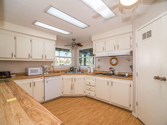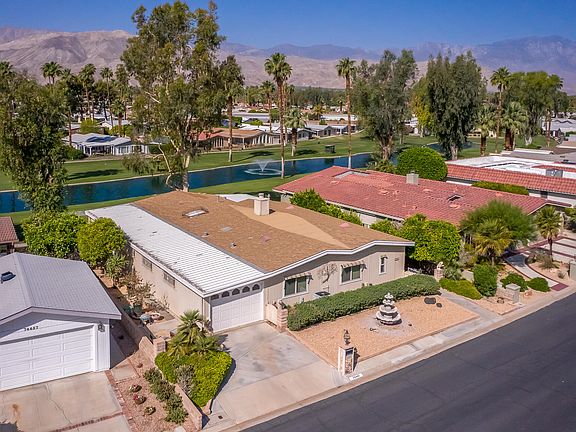 Back on the Market and Reduced! This triple wide Manufactured home in Portola Country Club is located on one of the prime sites in the community, overlooking 2 fairways and a peaceful lake surrounded by large stately trees. With southwestern views of the Santa Rosa Mtns to enjoy and a quiet interior location in the community, it would be hard to find a better spot to call home. Built in 1980 and with its original decor, this home features an enclosed side patio entry to the main great room living space with its focal point is the large rock fireplace with automatic gas starter. Also part of this grand space is a living room and bar area. There is a spacious kitchen with a large pantry, Breakfast bar for separation to the dining room with Pantry display cabinet to house the fine dishes and family artifacts. The remainder of the home has 3 BR and 2 Baths, a Laundry with extra Refrig and a connected 2 car tandem garage with extra storage and work station. The home is offered partially furnished. Portola CC is a 55+ community of 499 Manufactured homes on 18 holes of executive golf. Many Social Activities are included with the HOA of $358 mo. golf bingo, card room, gym, library, 3 pools/spas, tennis courts, dog park, and 80secured RV parking spaces. Trash and cable service also included. Call for your showing today!