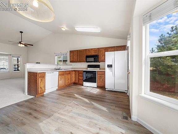 Lovely 4 bedroom ranch style home in The Glen! Newer carpet and LVP flooring throughout! Covered front porch enters to large living room with vaulted ceilings. Open concept floor plan leads into large eat in kitchen featuring pantry, large counter bar, abundent cabinetry, and walk out to concrete patio and fenced backyard! Master suite on main level with walk in closet and attached jack and jill bath! Additional bedroom on main level as well as laundry room. Finished basement features large family room and two additional large bedrooms in basement. Additional property amenities include central A/C and sprinkler system! New roof! Located close to schools, Fort Carson, hiking/biking trails and more!
