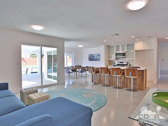 A truly modern masterpiece nestled in a desirable Palm Desert neighborhood! This 3 bedroom/2 bath home boasts beautiful views of the mountains, a luxurious pool and spa set in a spacious backyard and a generous patio area, perfect for entertaining and relaxation. The interior features exquisite porcelain tile flooring, sleek modern finishes and a completely remodeled kitchen and dining nook overlooking the pool. Bedrooms are spacious and the master has a large walk-in closet and refinished bathroom. Here is a modern gem waiting to be yours!
