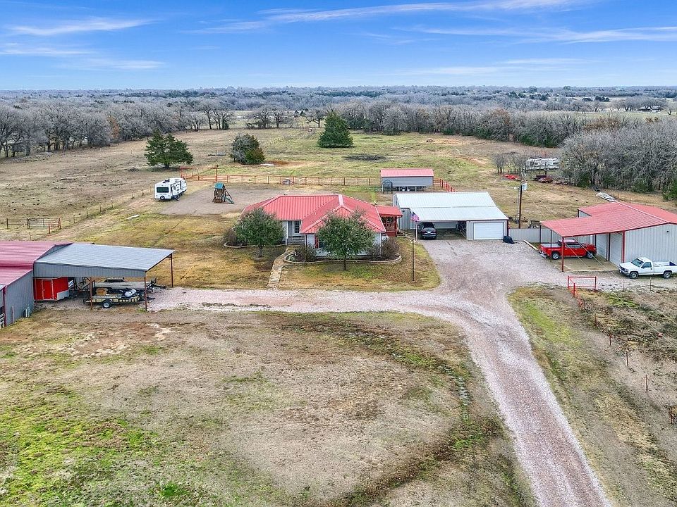 As you drive up the private driveway, you are greeted by the sight of sprawling pastures and mature trees, creating a peaceful setting that welcomes you home. This country home ample space for family living or weekend getaways. Step inside to discover a warm and inviting interior featuring a large living room perfect for gathering with loved ones. The primary bedroom offers a tranquil retreat with its ensuite bathroom. Additional bedrooms offer comfortable accommodations for guests or family members, each with its own unique charm. Outside, you will find several outbuildings to cover all of you needs for storage and animals. Located just west of Collinsville, residents of this property enjoy easy access FM 902 and Hwy 377. Experience the tranquility of country living in Collinsville, Texas, and make this charming property your own.