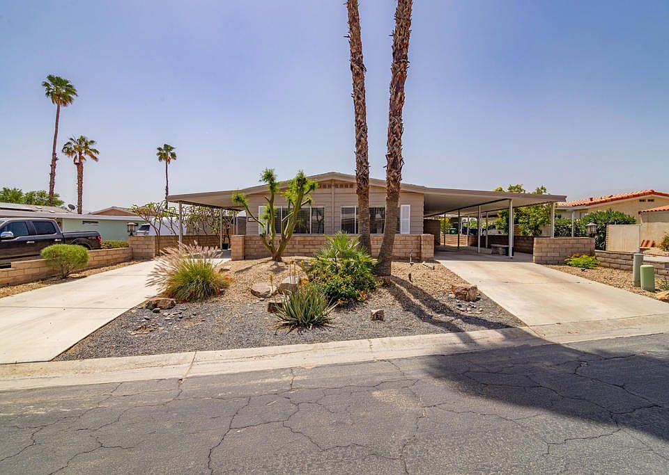 Welcome to paradise. This home is located in the gated community of Portola Country Club, a 55+ community. This highly upgraded property has been affixed to a permanent foundation, and has been upgraded throughout. The kitchen presents a WOW factor with stainless appliances, soft-close drawers, granite counters, and more! The master bath was previously remodeled. It is move-in ready and waiting for you. With leased Solar by RENOVA, you will enjoy a low fixed payment. The seller added a second driveway to allow for ample parking, and the two storage sheds provide extra space for your goodies. This beautiful development lies in the heart of Palm Desert so dining, shopping, and entertainment are very close. The low HOAs include GOLF, 3 pools/spas, dog park, tennis and pickle ball courts and lots of activities in the clubhouse. Schedule your showing now!