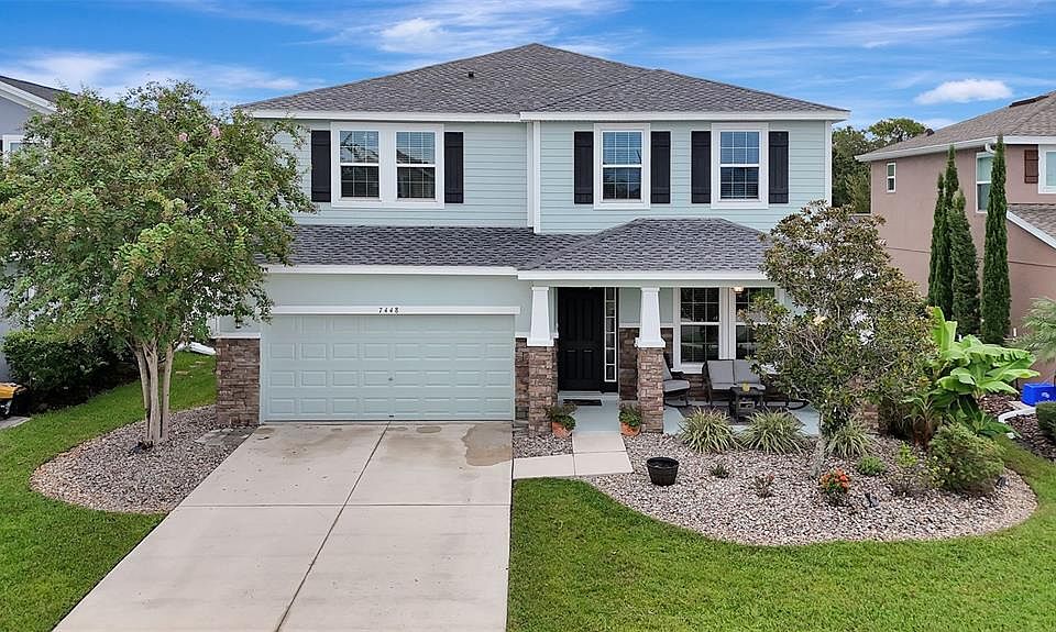 Imagine pulling into a neighborhood that feels tucked away yet so close to everything — At 7448 47th Avenue Circle East, every detail has been considered so you can simply move in and enjoy. From the moment you step inside, light bounces off freshly painted walls (2021) and new fixtures, while soft carpet underfoot (2021) gives the upstairs spaces a warm, welcoming feel. The brand-new roof (Aug 2025) and fresh exterior paint (2025) mean peace of mind for years to come. Even the little details — like updated landscaping (2022), leveled pool pavers (2024), and re-screened windows — speak to a home that has been cared for inside and out. The layout flows with both function and charm: a first-floor guest suite create a private retreat for visitors and the den for work-from-home needs, while upstairs, the primary suite becomes your sanctuary. It’s not just oversized — it features a cozy nook that’s perfect for curling up with a book, sipping morning coffee, or creating your own lounge space. Two additional bedrooms and a large bonus room make it easy to spread out, play, or gather together. Step outside, and life here just gets better. A sparkling pool and screened lanai set the stage for summer barbecues, weekend swims, or quiet evenings under the stars. Beyond the lanai, your yard offers a tropical touch with banana plants, an orange tree, and a Limon tree- all fruit bearing and perfect for picking fresh fruit before a swim or adding a homegrown twist to your favorite recipe. And when you’re ready to venture out, you’ll love how easy it is to get anywhere — just minutes from I-75, shopping, dining, and everyday conveniences. With a low HOA fee and no CDD, this community offers both charm and value. This isn’t just a house — it’s a home designed to be lived in, loved, and enjoyed for years to come.