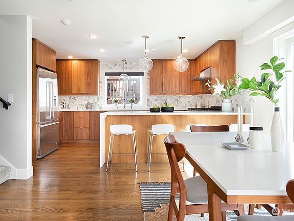 Rise + shine at this contemporary, stand-alone townhouse in the heart of Green Lake. Stroll to the lake for your morning jog, dog walk, paddleboard or yoga class. Within the block you can enjoy Green Lake Park, PCC, cafes, restaurants, Roosevelt light rail + endless other amenities. Come home to your entertainer's kitchen that features custom walnut cabinets, quartz countertops, marble backsplash, Fisher Paykel appliances w/gas range. Cozy up to your living room gas fireplace or outdoor fireplace on your Trex deck w/a dog run for Fido. Retreat to your upper floor primary suite w/5pc bath, vaulted ceilings, skylights & balcony, 2nd primary suite + A/C. Lower level bedroom w/full bath, is accommodating to guests, home office or Peleton.