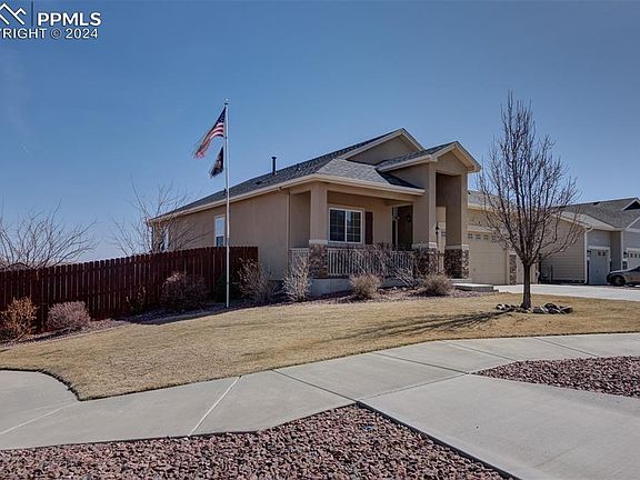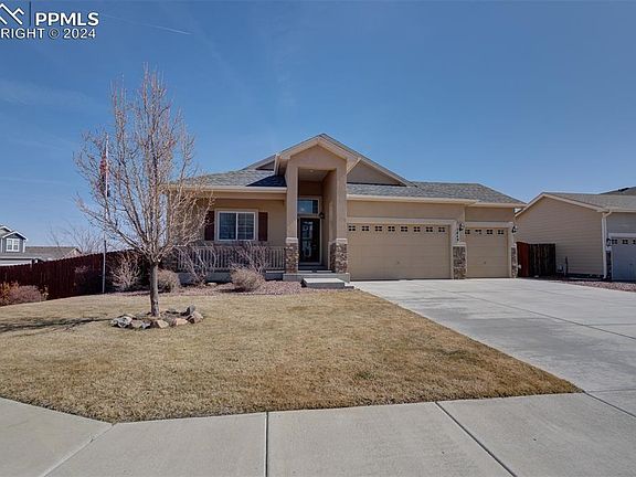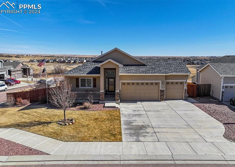 This beautiful 5BR, 3-Bathroom ranch style home with main floor living has so much to offer. Hard wood floors throughout traffic areas, granite countertops in the kitchen and all bathrooms. The kitchen opens to the living room w/ breakfast bar seating, stainless appliances, and pantry. Adorned with large windows and high ceilings the house has a bright and cheery atmosphere. A rock embellished gas fireplace w/ gorgeous wood mantel is inviting on those cold Colorado winter nights. The open floor plan is great for entertaining and has a large deck accessible from the dining room. Master bedroom w/ separate his & her vanities, large soaking jet tub, large walk-in shower and walk in closet. There is a spacious finished garden level basement, with 2 additional bedrooms, bathroom and walk out to the backyard. Entertaining made easy with a comprehensive bar area and walk-out to covered patio and a gazebo covered hot tub. The house sits on a large corner lot w/ shed, side yard, and large grass and rock landscaped backyard. Located near open space, walking trails and community park. Also, conveniently located near I-25, the Powers Corridor, Colorado Springs Airport, and Ft Carson. This home includes a 3 car attached garage w/door opener to house your cars and other toys.