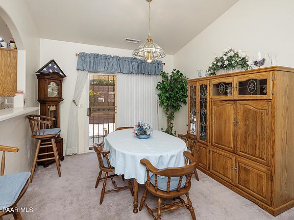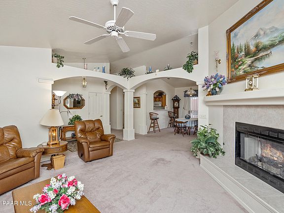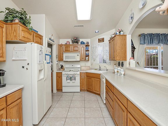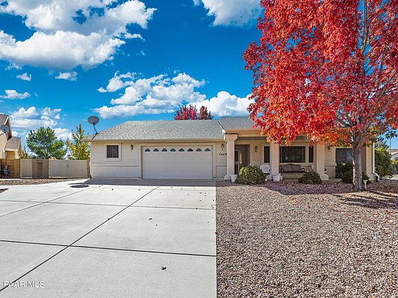 Just a short walking distance from Viewpoint Park, this beautiful, open and spacious, split floor bedroom floor plan Prescott Valley home offers great curb appeal with a corner lot on a cul-de-sac. Upon entry you are greeted by a spacious living room that features a vaulted ceiling, double-arched entrance and a beautiful, welcoming gas fireplace! The well-organized kitchen has large counter space with new quartz countertops and new stainless steel appliances, abundant storage and a RO filter system. The large dining area has a sliding security door offering access to the rear yard with an extended flagstone patio, Pink Lady and Fuji apple trees, flagstone patio leading to a second patio area, planter boxes, and shed. The generously sized owners suite features an enclosed shower, extra-large tub, double vanity and an extra-large walk-in closet. The guest bedrooms are large and one has a walk-in closet. Single vanity and tub/shower combo in the guest bathroom. The extra large garage has the perfect flex space for storage or a workshop. Laundry room off the kitchen with utility sink, upper cabinets and a window for daytime natural lighting. The water heater and air conditioning system were replaced less than five years ago, new roof updated in 2022 as well! A whole home filter and water softener are also installed. New luxury vinyl plank flooring throughout the entire home. Double gates lead to a parking space in the fully block fenced rear yard. Mature landscaping front and back impeccably manicured, this home has a lot to offer!