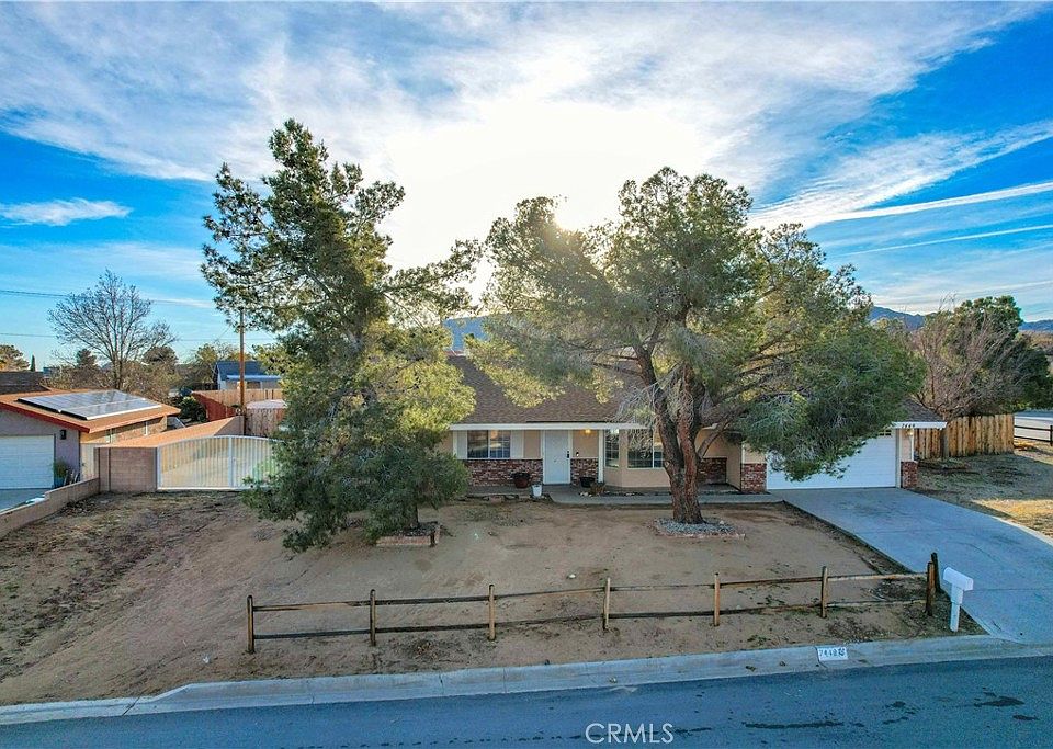 This gorgeous 3 bedroom, 2 bath + bonus room home is situated on a generous corner lot of nearly 1/4 acre in the highly desirable Western Hills Ranchos area of Yucca Valley! As you approach the home from paved Hermosa Avenue, you'll feel welcomed in right away by the decorative split rail fencing that frames the front yard, large shady pine trees, paved driveway leading to the 2 car garage, and brick accents on the facade of the home. Step inside to find yourself in a massive, open living room with beautiful wood-look flooring, a bay window to let in lots of light and views, and a cozy wood stove with brick hearth for ambiance and supplemental heat. The kitchen and dining area enjoys tile flooring and countertops, plenty of warm wooden cabinetry, and even a gas stove for the discerning chef! You'll also note French doors in the dining area that lead to a breezeway, followed by a nicely sized bonus room that could serve as an office, studio, fourth bedroom or anything else you need! The primary bedroom is spacious, while the large attached bath is well appointed with tile countertops, dual sinks, hot tub and large walk-in tiled shower. You'll find the second and third bedrooms to also be nicely sized and well lit, while the guest bath features a tub/shower combo for all your needs. Moving on to the backyard, you'll appreciate the wooden privacy fencing, mature shade trees and landscaping gravel. Along the side yard you'll also find a large concrete parking pad behind a double wide gate, perfect for an RV or additional parking. This great home won't last long on the market, so book a showing to see this beauty for yourself!