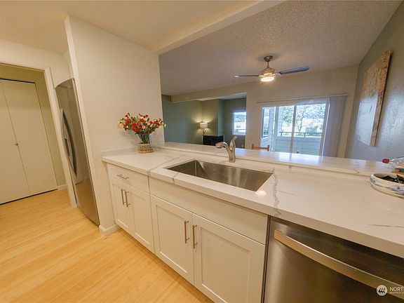 Charming 1 BR, 1 Bath, boasting a bright East-Facing orientation. Stunning views from the spacious deck overlooking the Cascades. Conveniently close to Microsoft, Marymoor Park, Grass Lawn Park and Redmond Town Center. The living area features bamboo style laminate flooring and a cozy wood burn fireplace. Bed Rm has brand new carpet. Remodeled Kitchen has new countertops, cabinets. New cook range, oven, new microwave. Update bathroom with new floor, cabinet, faucet and lighting. Fresh Paint adorns all walls in the unit. Washer & Dryer in the unit. Carport parking space #67 & storage rm in the same place. Complex has an outdoor pool. Plenty guest parking space. No rental Cap, great opportunity for investors to have 5% ROI right off the bat.