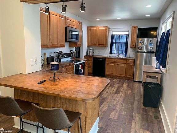 Well kept and a great location. This 3 bedroom home is one block from the Rec Center and loaded with RECENT UPDATES which include entire kitchen with breakfast bar & butcher block counters, bathroom with walk-in shower, main level flooring, furnace, air conditioner, and water heater. The upstairs features hardwood floors, 3 bedrooms, and a half bath. Plenty of places to relax with 2 enclosed porches, deck, patio, and 2 stall insulated detached garage all nestled in a quiet neighborhood. Call today for your private showing!!