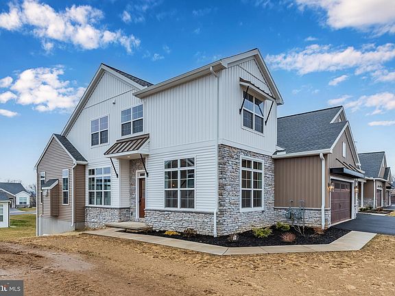 UNDER CONSTRUCTION: This 2-story, end-of-row townhome located in a 55+ lifestyle community by Landmark Homes, includes a 2-car garage with mudroom entry and built-in lockers and bench. Stylish vinyl plank flooring and 10 ft ceilings flow throughout the first floor. Adjacent to the foyer is the formal dining room to the right and breakfast area to the left. The kitchen is well-appointed with stainless steel appliances, quartz countertops with tile backsplash, and a large center island. The family room features a cathedral ceiling, a fireplace with full height stone surround, and sliding glass door access to the rear deck. Tucked quietly to the back of the home, the owner’s suite boasts an expansive closet, and a private bathroom with tile shower and double bowl vanity. On the 2nd floor is a loft, two additional bedrooms, a full bathroom, and a finished storage room.