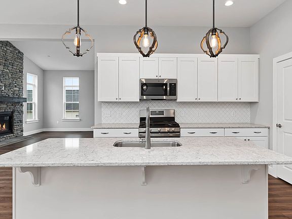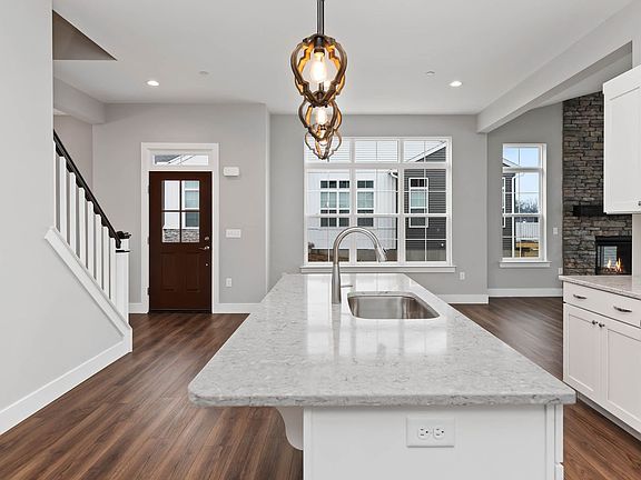This 2-story, end-of-row townhome located in a 55+ lifestyle community by Landmark Homes, includes a 2-car garage with mudroom entry and built-in lockers and bench.. Stylish vinyl plank flooring and 10 ft ceilings flow throughout the first floor. Adjacent to the foyer is the formal dining room to the right and breakfast area to the left. The kitchen is well-appointed with stainless steel appliances, quartz countertops with tile backsplash, and a large center island. The family room features a cathedral ceiling, a fireplace with full height stone surround, and sliding glass door access to the rear deck. Tucked quietly to the back of the home, the owner's suite boasts an expansive closet, and a private bathroom with tile shower and double bowl vanity. On the 2nd floor is a loft, two additional bedrooms, a full bathroom, and a finished storage room. Amenities: Daylight Basement