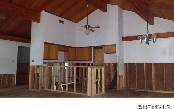 Huge end of the road property straddling Chunns Cove & Town Mountain with existing partially dismantled home ready for rehab. Home suffered water damage & is stripped down for remodel. Large great room with central fireplace and pine T&G vaulted ceiling. Large deck with covered section. Big family room in basement also with fireplace. Wooded land, but great view potential & sites for more homes. Septic unknown. Subject to court approval,cash only