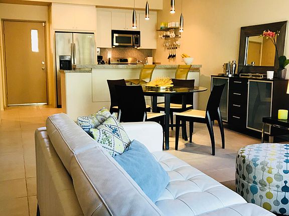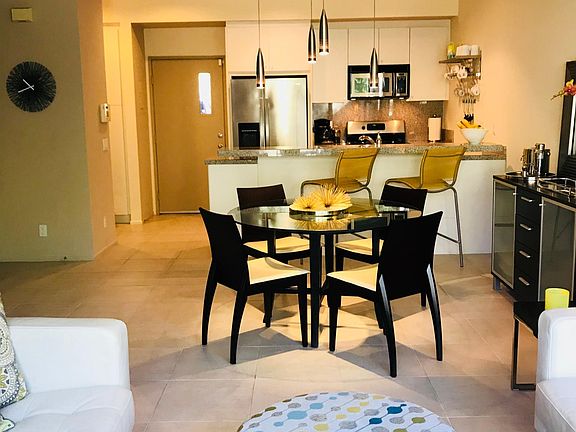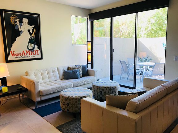 This 2 bedroom, 2.5 bath townhouse/condo is in the heart of downtown Palm Springs! 48@ Arenas is within blocks of restaurants/bars, movies, spas, a casino, a world class museum, live entertainment, shops, and terrific hiking trails with amazing views of the Valley. Form and function abound in the contemporary furnishings throughout this condo. The kitchen is fully equipped for the chef, baker, & cocktail maker! The full sized laundry is tucked away next to the kitchen. Upstairs, each of the spacious bedroom suites are welcoming retreats with rich linens, plush towels, and from the master suite a striking view of the Witches Canyon! The master suite has a walk-in shower. The guest suite has a shower over tub. Not to be forgotten, the patio has a Weber BBQ. This award winning property boasts views from any of the 4 pools and spas. Due to COVID19 pool access is limited per county/state mandate. LONG TERM VACATION RENTAL. 1 Month min. per HOA. We provide Expanded Cable, WIFI, and monthly house cleaning. Summertime electric use over $150.00 paid by tenant. Tenant pays exit cleaning. No pets, no smoking. Tenants shall pay monthly house cleaning for stays of 40 days or more. Rates vary and may change at any time. All prospective tenants shall digitally sign a Property Entry Advisory and Disclosure document prior to viewing condo. Tenants to complete CAR Rental Form with Owners who are CA Realtors. Tenants shall acknowledge & abide by HOA Rules & Regs. Seasonal rate change: Now - August 31st $2550. USD monthly September - May 2021: $3,000. USD monthly June - August 2021: $2550. USD monthly