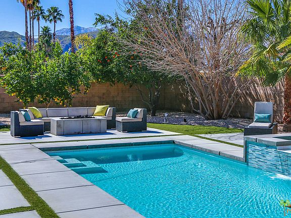 This mid-century home was rebuilt in 2015 - down to the studs and beyond! A gorgeous new pool and spa were built in 2015 and the backyard was newly landscaped & a concrete fire-pit and built-in barbeque were added - perfect for Palm Springs entertaining! The list of all that was done is available - this is almost a new home. Triple insulation in the ceilings & roof & double pane windows & doors keep out sound and create a super energy-efficient home. The open living room, dining room & kitchen have a slider to the back patio covered with a deep shade overhang. Three bedrooms and 2 baths with gorgeous tile showers. The Master bedroom also has a slider to the backyard. Wait until you see the size of the garage! Plenty of room for 2 cars, laundry & a workshop! Great mountain views and 1/2 block from Demuth Park. This could be a perfect primary or secondary home in Palm Springs. This home has a vacation rental history, comes furnished and would make an excellent income property.