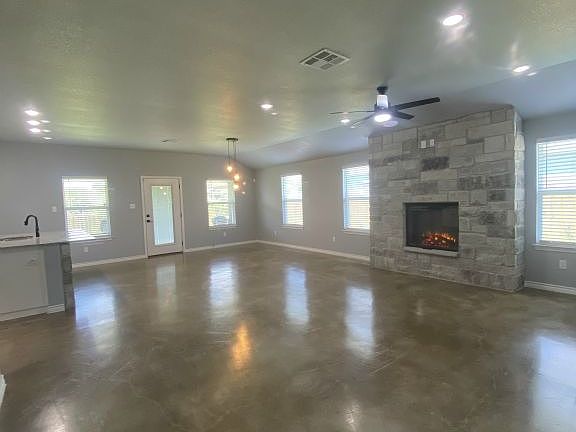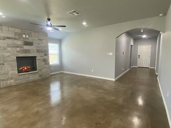 Step into modern comfort with this beautifully designed home featuring polished concrete floors throughout and a spacious, light-filled living area. The open-concept layout boasts recessed lighting, an electric fireplace, and large windows that flood the space with natural light. The kitchen is a chef's dream, complete with a central island, sleek granite countertops, stainless steel appliances, a pantry, and ample cabinetry for storage. The generously sized primary bedroom includes a ceiling fan and leads into a luxurious en-suite bath with dual vanity sinks, a separate soaking tub, a walk-in shower, and a large walk-in closet. Each minor bedroom offers comfortable space, with one enjoying its own private bathroom. Additional amenities include a laundry room, a covered back patio and a fully fenced backyard with a wood privacy fence. Call and schedule a viewing today!