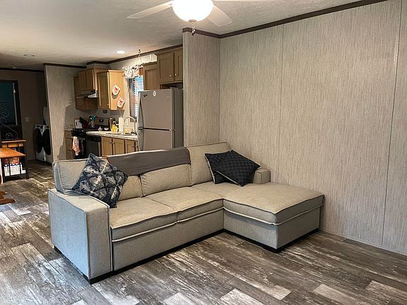 Like-new, open concept 2022 single wide on ample lot. Primary suite with full bath and walk-in closet, along with 2 additional bedrooms and full bath. Kitchen with stainless appliances and propane stove. New laundry machines with efficient front loader washer.