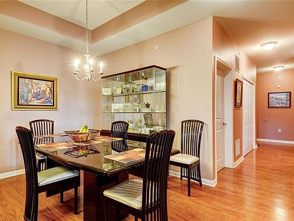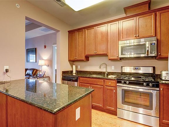 Dexter Model, 1,441 sq. ft. Penthouse Corner unit. 2 BR & den, Upgraded Hardwood floors, 9 ft. Coffered ceilings, 2 Full baths w/floor to ceiling upgraded tile. Kitchen w/island, granite counter tops, 42" wood cabinets, wine rack, Stainless Steel Appliances, Samsung Side by side Refrigerator & Maytag SS Washer & Dryer included. Custom window treatments stay. Freshly painted interior. Balcony w/Sliders to MBR & LR. Van service to the Edison train station. Special height custom vanity in Master bath-(6" taller). Carpeting in the bedrooms. Den can be used as a third BR, entry foyer has a large closet. Elevator in the building, Intercom to allow entry. 1 car attached garage w/opener.