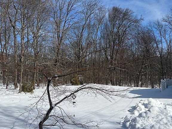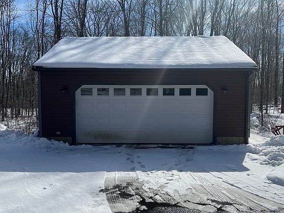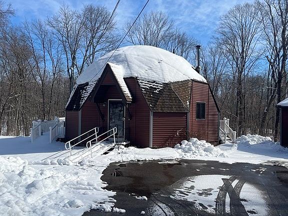 A very unique opportunity to own this Geodesic Dome on private 5-acre wooded setting. This home features 3 bedrooms (2 up, 1 down) and 1 bath. The open concept floor plan boasts a family room with custom handmade wooden ceiling. Additional room on the first level can be used as an office/playroom. Kitchen slider leads to one of the main features of this property, a 1,000 square foot wrap-around deck overlooking the huge, private yard. The entertainment options are endless! 2-car, detached garage and large 20x12 shed allow for plenty of extra storage. The unfinished basement does include walk out access. A little TLC could make this one of a kind property a rare gem.