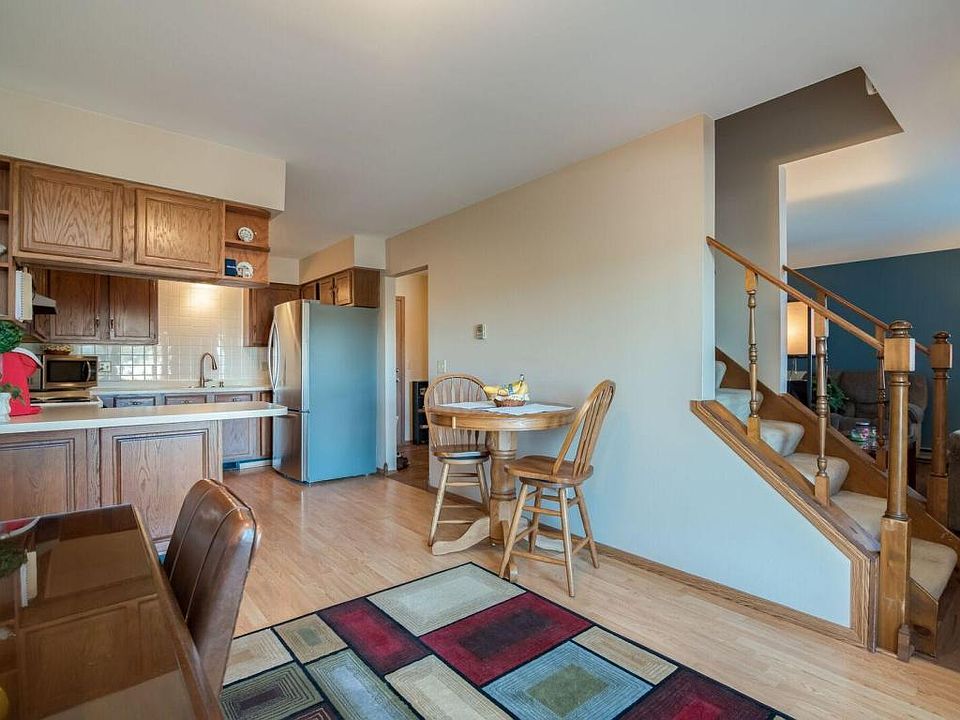 This updated and clean condo will sure impress you!2 story unit offers a nice flowing floor plan.KIT offers ample cabinets,snack counter,laminate floors&includes all appliances.Living room has beautiful,newer high end wood style flooring.Upstairs you will find 2 large BDRMS each w/2 closets,a gorgeous updated Full BA & private laundry room which includes full size washer & dryer.2 car underground parking,storage area,and private entrance from patio are more great features.Perfect location on the edge of town, near golf course and shopping.Low monthly dues. Make this your new home today!