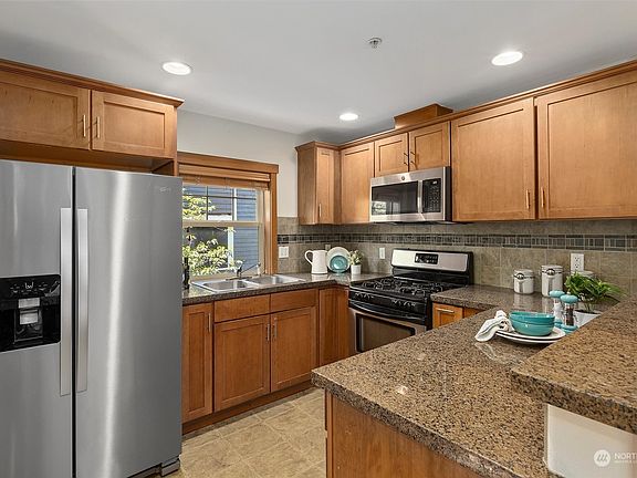 Light filled spacious townhouse in the quiet neighborhood of Greenwood. Main floor features an open kitchen w/granite countertops, bamboo floors throughout, spacious living & dining room w/cozy gas fireplace, half bath & Juliet deck. Upstairs features vaulted ceilings, laundry, two bedrooms & a full bath which can be accessed from primary bedroom as well as hallway. City view from Primary bed. Attached one car garage w/room for second car and small side yard for fido, make this a win! Recent updates include - fresh exterior paint, interior paint, brand new carpet, new tankless hot water heater, fridge & micro. Conveniently located w/easy access to bus lines, hwy 99 & I-5 for commuting. Greenlake, parks & shopping are just steps away. No HOA