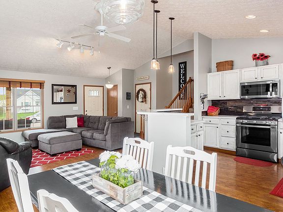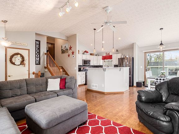 Pride of ownership and so much space! Multiple levels to entertain. Updated kitchen opens to living room and dining. Lower level family room with 1/2 bath and add'l bedroom/den. Large 4th level perfect for a flex/playroom/home gym. Great outdoor living! Relax on the newly added front porch or host cookouts on the stamped concrete patio. Great shed for added storage. Backs to land. Just outside the village. A great amount of updates in 2020 include new roof, gutters and gutter guards. Siding, trim and garage door painted. New covered front porch added! Quartz countertop, new sink, faucet, garbage disposal and fingerprint resistant stainless steel appliances in the kitchen. Freshly painted living room, kitchen, dining and 2nd bedroom. New water heater in 2021. A lot of home for the price!