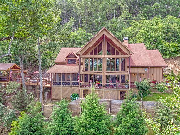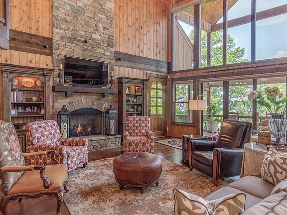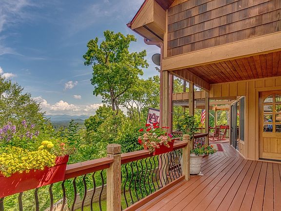 This beautiful home takes mountain views to a whole new level; enjoy the view from nearly every room & deck in the house. Enter to a large open floor plan w/cozy stacked rock fireplace, cathedral height wall of windows & natural light that fills the living room & kitchen. Kitchen boasts custom cabinetry w/under-mount lighting, granite counters, breakfast bar & wine cooler just to name a few. Large pantry/laundry room & guest bath are located off the kitchen. 2 car garage located off kitchen makes carrying in groceries a breeze. Large master suite has gas fireplace perfect for winter nights, screened deck access for spring & summer days, large bath w/dual vanities, garden tub, walk-in shower, gas log portrait fireplace & huge closet. Upstairs you'll find 2 bedrooms, full bath & loft den perfect for work or play. Tongue & groove walls/ceilings & wood flooring throughout. Enjoy the seasons through all the windows or outside from multiple decks & seating areas; so many options... covered, screened OR out in the open. Great space to entertain, grill & relax with professional installed lighting. I can only imagine sitting outside w/a cup of coffee in this peaceful, mountain setting.