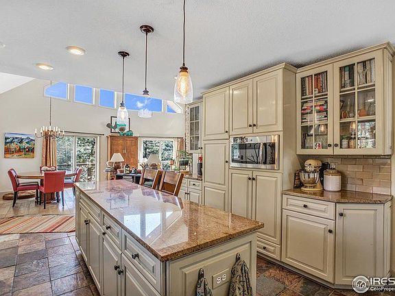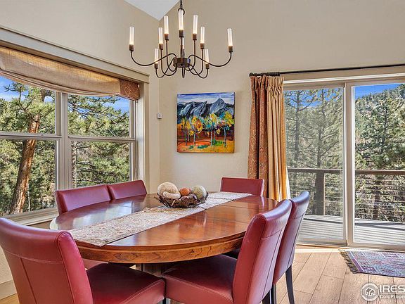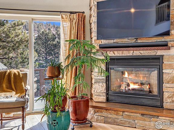 Easy mountain living only 12 minutes above Boulder. Spacious living room with vaulted ceilings and cozy fireplace. The kitchen has breakfast island and high-end Wolf range. The sliding glass doors in living room and dining room access the deck. The master bedroom has walk-in closet, luxury bathroom, gas fireplace, and direct access to patio with hot tub. Wood flooring throughout the main level. The upper level has loft office with cathedral ceilings in addition to two large bedrooms. The lower level has family room with built-in cabinets and access to patio. Marvelous stonework, steps and patio with built-in grill - great place to entertain. The home has an advanced solar radiant heat system and state-of-the-art water purification system. Pleasant mountain views.