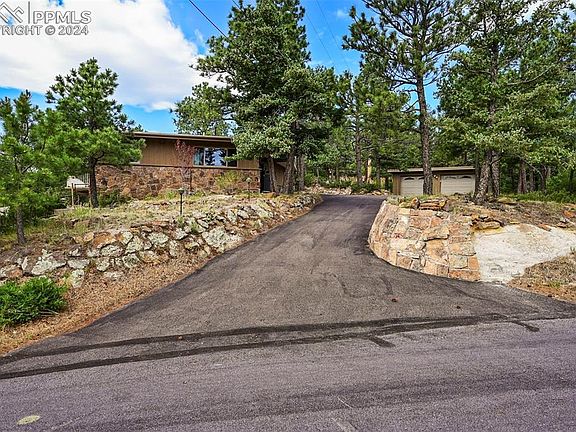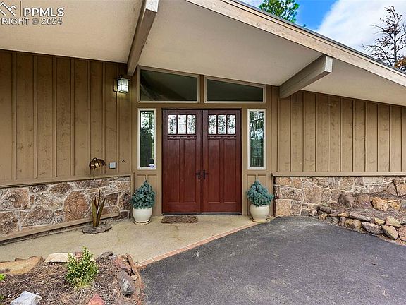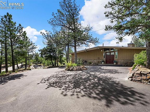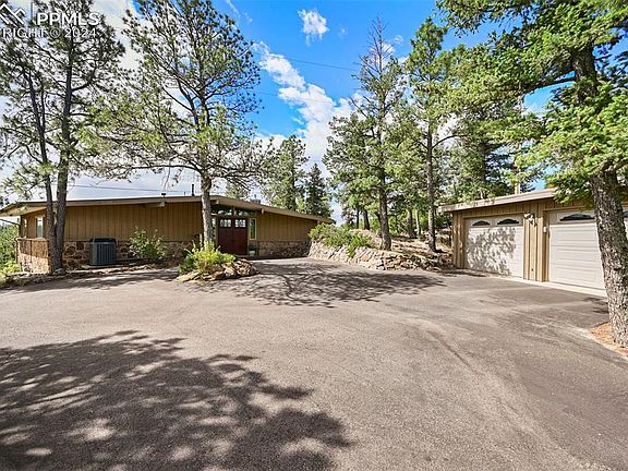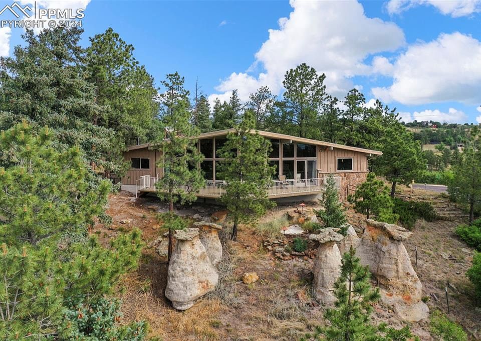 Nestled among towering pine trees and serene rock formations on over 2 acres in Woodmen Valley, this contemporary ranch-style retreat offers unparalleled privacy and breathtaking views just moments from city conveniences. This updated home features an inviting open floorplan, all on one-level and is flooded with natural light from the bank of windows that frame the views of the tall pines, hoodoo rock formations and the city lights. The expansive concrete deck spans the rear of the home, perfect for enjoying the scenery or entertaining guests. Inside, the residence boasts a grand foyer with double doors, stunning stone flooring, and exposed beamed ceilings. The great room is highlighted by a wall of windows, high vaulted ceiling, wood floor and a gas fireplace accented by stone. The adjacent dining area has a butlers’ pantry, wine fridge and access to the deck. The updated kitchen is a chef’s delight with granite countertops, custom backsplash, beautiful cabinetry, newer appliances, and ample natural light. The master suite impresses with built-in storage and a modern ensuite bath showcasing dual sinks, granite counters, and an oversized shower. The secondary bedrooms offer built-in features and are serviced by an updated full-sized bath. Outdoor amenities include a large concrete deck with city and mountain views, a gas line for grilling, and a detached oversized two-car garage. Located in the sought-after D20 School District with easy access to I-25 for commuting to Colorado Springs or Denver, this unique property combines secluded mountain living with modern convenience and must be seen to be fully appreciated. It has been enhanced with newer plumbing & electrical systems, tankless water heater, security system, and custom Milgard windows with custom blinds.