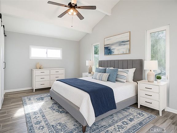 Enjoy the peacefulness and privacy of this beautifully updated 4-bedroom, 3-bath home with sweeping views of the San Fernando Valley's city lights and surrounding mountains. Located in a quiet hillside location, this home offers comfort, charm, and plenty of space to live and entertain. Inside, the home features fresh new interior paint, an open floor plan with beamed ceilings, hardwood floors, recessed lighting, and dual-pane windows. The remodeled kitchen includes stone countertops, stainless steel appliances, a new stove top, custom cabinetry, and it comes with a refrigerator. A spacious dining area, living room with fireplace and art niche, and a first-floor bedroom with full bath all enjoy views of the backyard. An indoor laundry room with washer and dryer adds convenience. Upstairs, the primary suite features barn doors, a remodeled bath, walk-in closet, and great views. Two additional bedrooms are located on the opposite sideone with a custom overhead storage loft. There's also a finished attic space with a mini-theater area. The long, tree-lined, stamped concrete driveway leads to a two-car garage and offers parking for several more vehicles. The large backyard is ideal for relaxing or entertaining, with new wood rail tie steps, artificial turf, space to garden, a hot tub, and a sizable storage shed that can be used as an office or workshop. A newly built deck sits at the top of the yard, offering views of the city and mountains. Additional basement storage is easily accessed from the garage. A short distance from CSUN, this Ventura County home is perfect for anyone looking to enjoy comfortable living in a peaceful, scenic neighborhoodclose enough to the city, but away from the hustle and bustle. Some pictures have been virtually staged