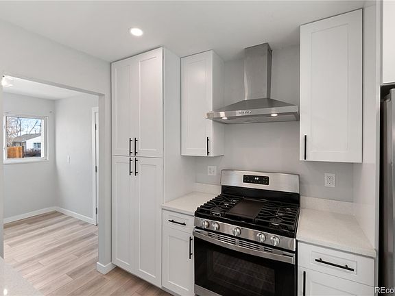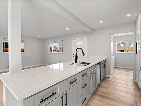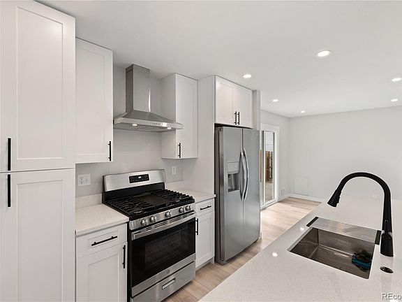 Welcome to this beautifully remodeled 3 bedroom, 1 bathroom ranch-style home! This charming property has been completely transformed and is ready to move in. Upon entering, you will be greeted by a bright interior with a spacious open floor plan, new LVP flooring and paint throughout, perfect for entertaining. The recessed lighting, stylish updates, and modern finishes provide a warm and inviting atmosphere. The kitchen features stainless steel appliances, white quartz countertops, and quiet soft-close cabinets for storage. Large cabinet pantry features outlets for small appliances to conserve counterspace and provide a clutter free atmosphere. The 3 bedrooms are located down the hall, each offering ample space for a comfortable and relaxing night's sleep. The bathroom has been fully updated, with a new vanity, shower, and tile. The newly added sliding glass doors to the patio provide the perfect opportunity to entertain and enjoy Colorado's amazing weather.